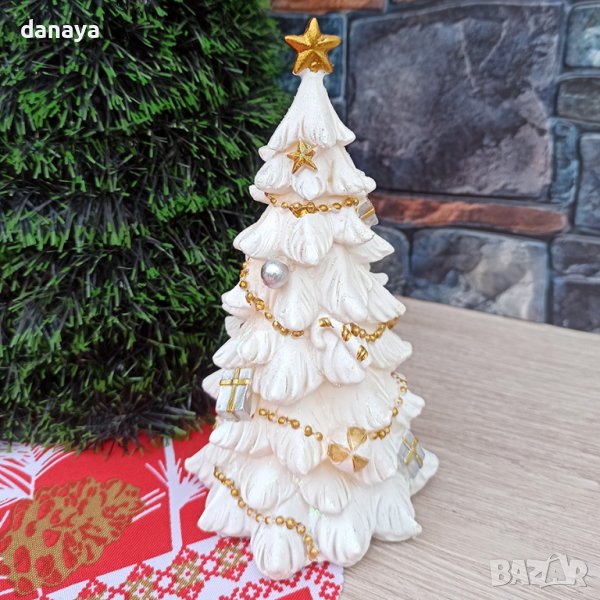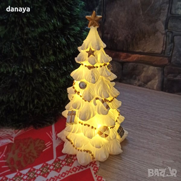 Снежна коледна елхичка, украсена с гирлянди и коледни играчки. Красива коледна декорация. Елхичката свети в мека нежна светлина. Работи с 3 батерии тип LR1130, които са включени в комплекта.