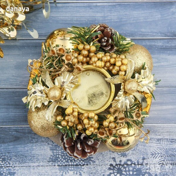Красив коледен свещник, предлаган в два изящни модела. Поставка за чаена свещ, декорирана с елхови клонки, шишарки и златни блестящи елементи. Прекрасна декорация за коледната маса. Поставките са поместени в празнична опаковка, много подходящи са и за подарък.