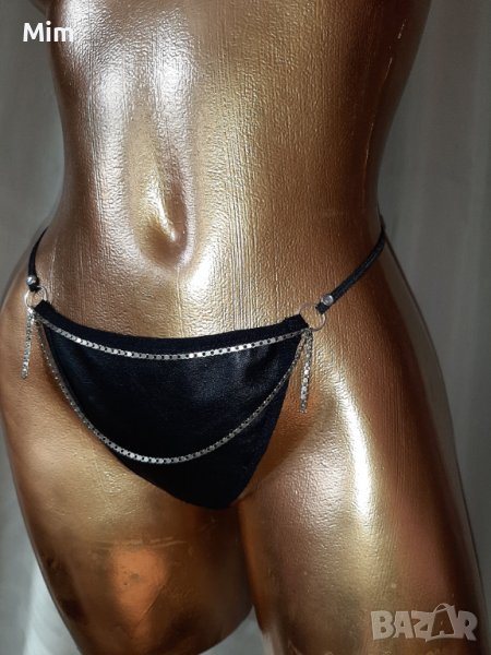 Черна кожена прашка със синджири в предната част, в талията с тънък еластичен ластик който позволява да се мени размера. Неразличими от нови без хартиен носител.