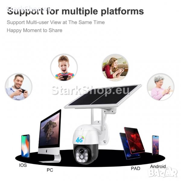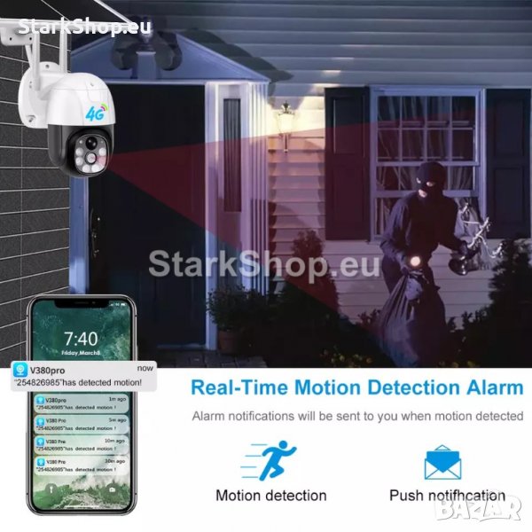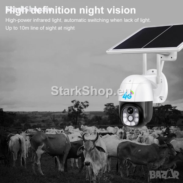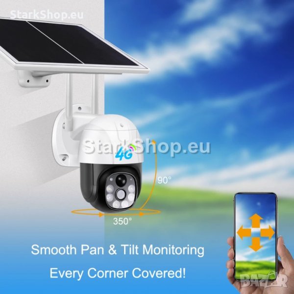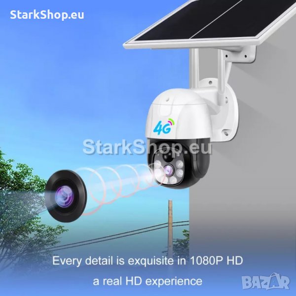 Въртяща камера със соларен панел и безжична 4G връзка( SIM карта) – 6LED с елегантен дизайн, качествена картина с 4 мм фокусно разстояние и запис директно върху карта памет. Камерата може да се завърти на 350 градуса хоризонтално и на 90 градуса вертикално. Чрез мобилният си телефон можете да контролирате ъгъла на въртене на лентата. Камерата е с вградената Li-ion батерия, която се зарежда от соларния панел. Изключително лесна за инсталация и употреба. Соларният панел може да бъде демонтиран от камерата и поставян на място с по-голям достъп на светлина. Камерата е отлично решение в изграждането на видеонаблюдение в големи търговски обекти, жилищни кооперации, офис сгради, хранителни магазини и други частни обекти. Поради характерната си форма на полусфера камерата е изключително елегантна и се вписва много добре в интериора на всяко помещение.