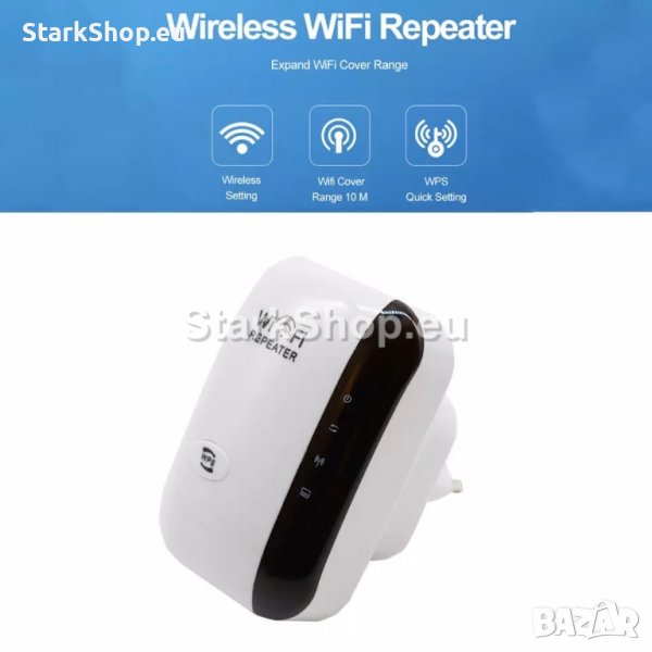 Какво представлява това? WiFi Repeater или повторител служи за повтаряне на съществуващият сигнал, идващ от точката на достъп или рутера, като по този начин увеличава радиуса на действие на Wi-Fi сигнала. Безжичният WLAN Repeater разширява мрежата и увеличава скоростта. Усилва и стабилизира интернет сигнала до 100%. Включва се директно в контакта, удобен, незабележим, конфигурира се лесно с името и кода на Вашата мрежа. На корпуса на рипитъра е разположен и порт за включване на мрежов кабел, благодарение на което устройство може да играе ролята на стандартна точка за достъп.