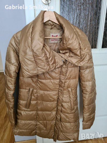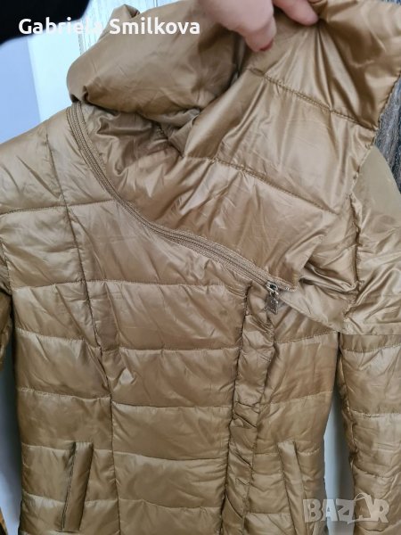 Есенно-зимно яке. Дължина над коляното. Голяма яка, която е с цип, може да се носи по- затворена и по-отворена. Не е много дебело. Златист цвят. Без забележки. Размер S-M.