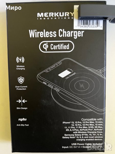 Безжично зарядно у-во съвместимо с iPhone и Samsung на 2 -та снимка са изписани моделите на съвместимите телефони.