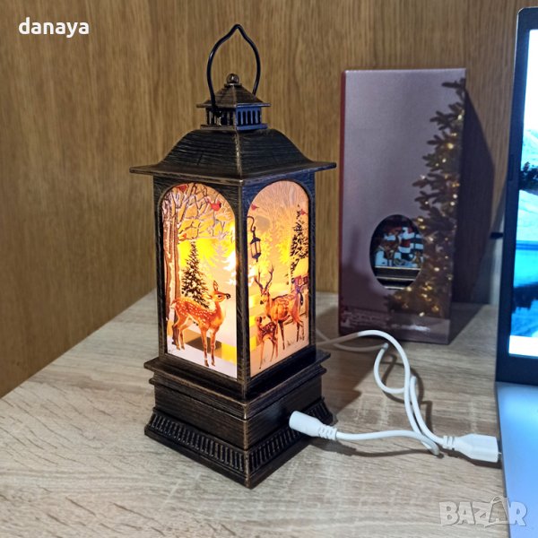 коледен фенер с приказен снежен принт от четирите си страни с Дядо Коледа или приказна снежна картина с елени. Може да се закачи и да се превърне в приказна висяща коледна украса. Вътре във фенерът има лед свещичка, която свети в много мека светлина. Фенерът може да работи с USB кабел, или само на батерии (3 броя ААА батерии, не са включени в комплекта).