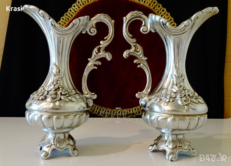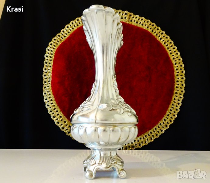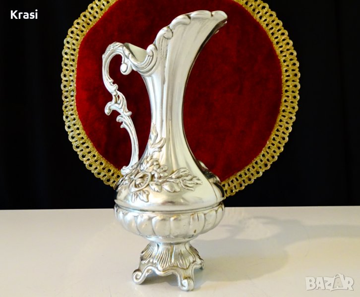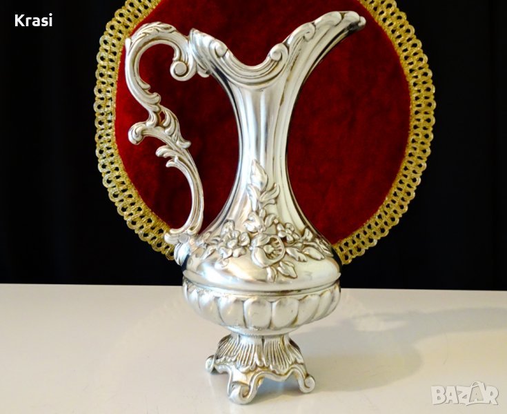 Старинна италианска кана за вино,ракия,майсторска ръчна изработка от 95% калай и 5% сребро.Високо качествена,масивна,релефно декорирана от две страни с цветя и барокови орнаменти.Вътре е като нова,мисля,че не е ползвана.Височина 18 см.,диаметър 9 см.,тегло на всяка 500 гр.