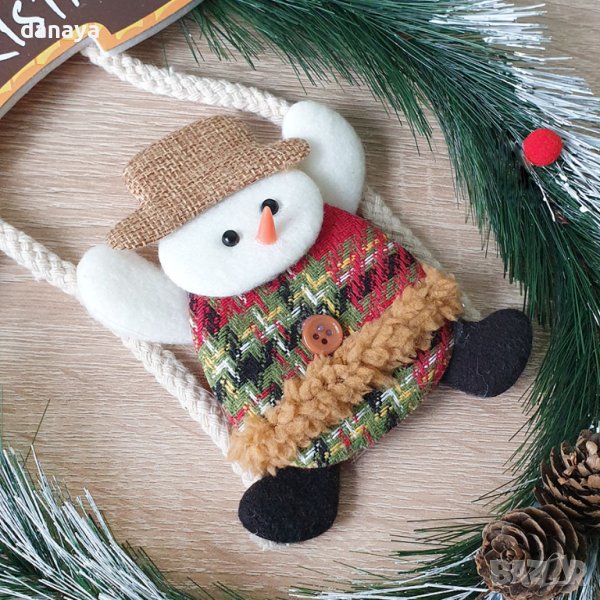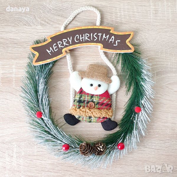 Коледна украса – коледен венец за врата или стена, изработен от изкуствена елхова клонка и красиво декориран с висящ снежко. Венецът си има и табелка с надпис Merry Christmas. Красива коледна декорация за вълшебния празник.
