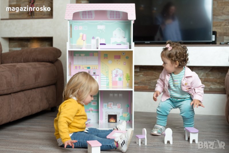 Подарете на Вашето малко момиче едно страхотно изживяване с тази оригинална играчка – дървена къща за кукли с обзавеждане. Къщата е толкова реалистична и красива: тя е на 3 етажа и има 4 прекрасно обзаведени стаи. Към нея има 8 бр. цветни аксесоари.
