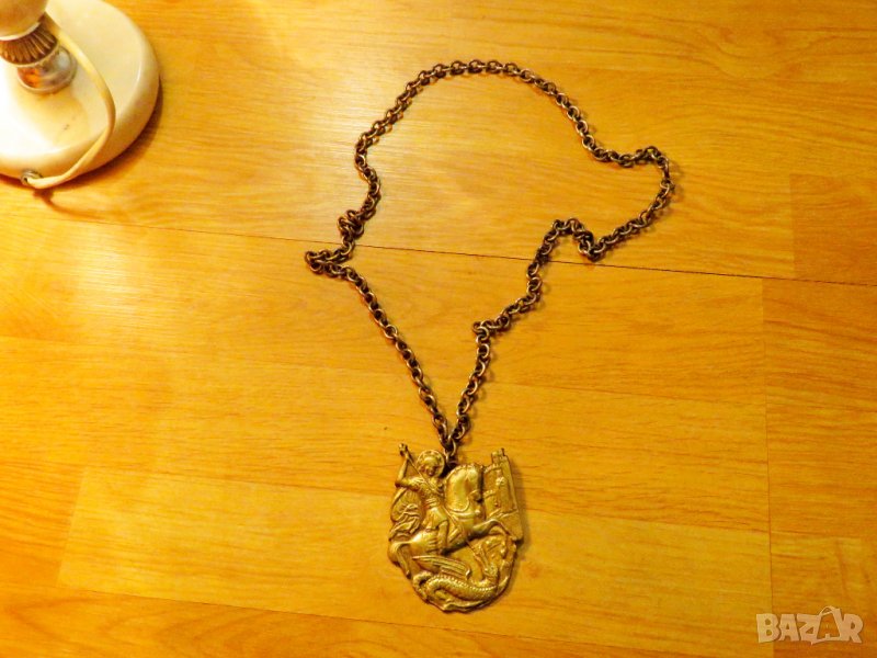 Старинна солидна възрожденска бронзова икона и бронзов синджир, нагръден медальон със Свети Георги Победоносец - вашия покровител и защитник.