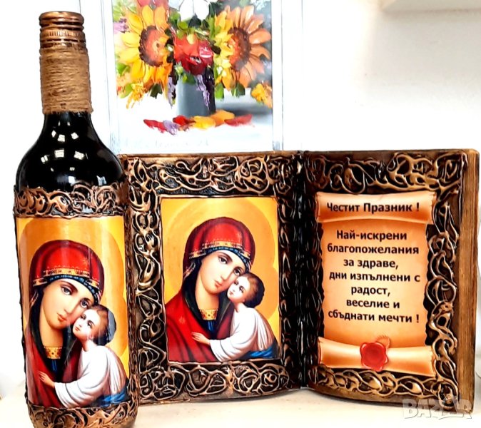 Може да съчетаете с авторска книга - икона за дом, с Честит празник или юбилей с различен светец, оригинално пожелание и съответните цифри на годишнината или юбилея.