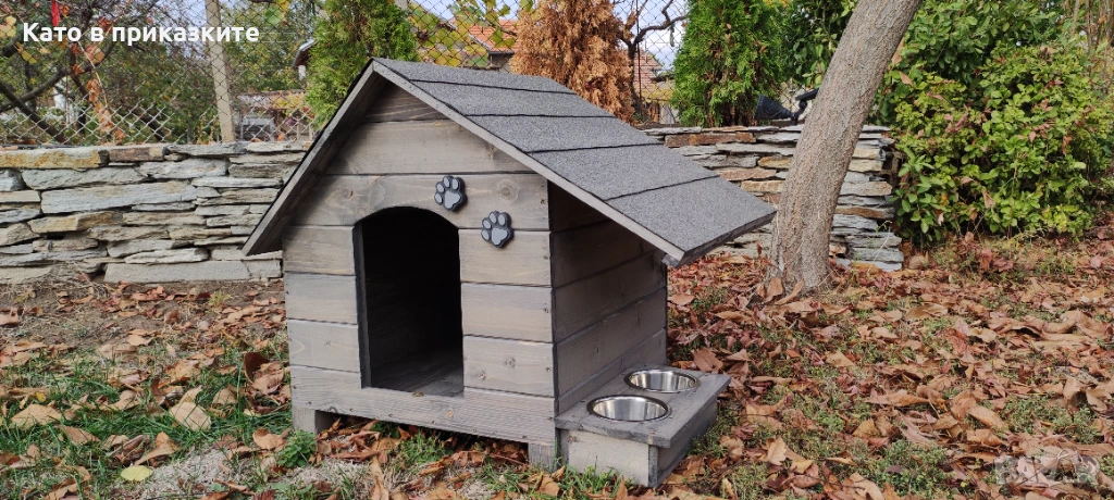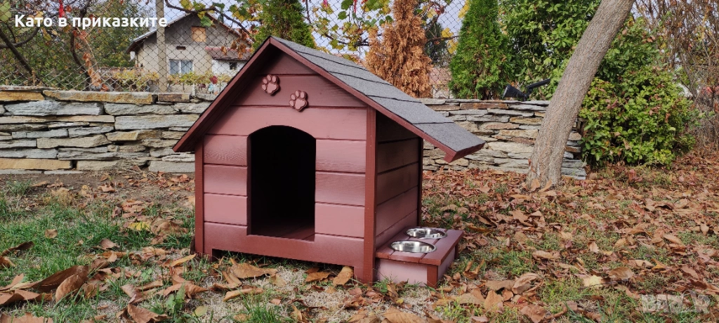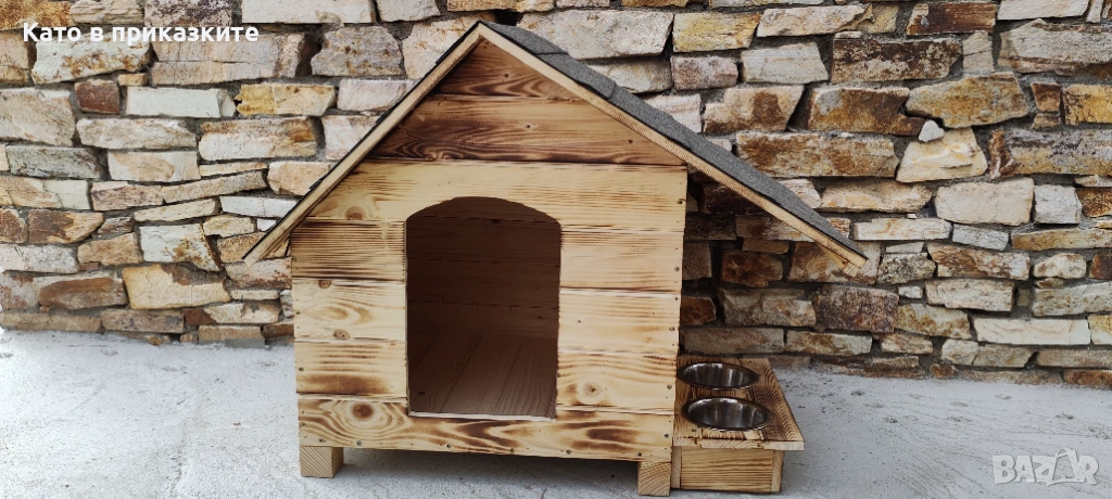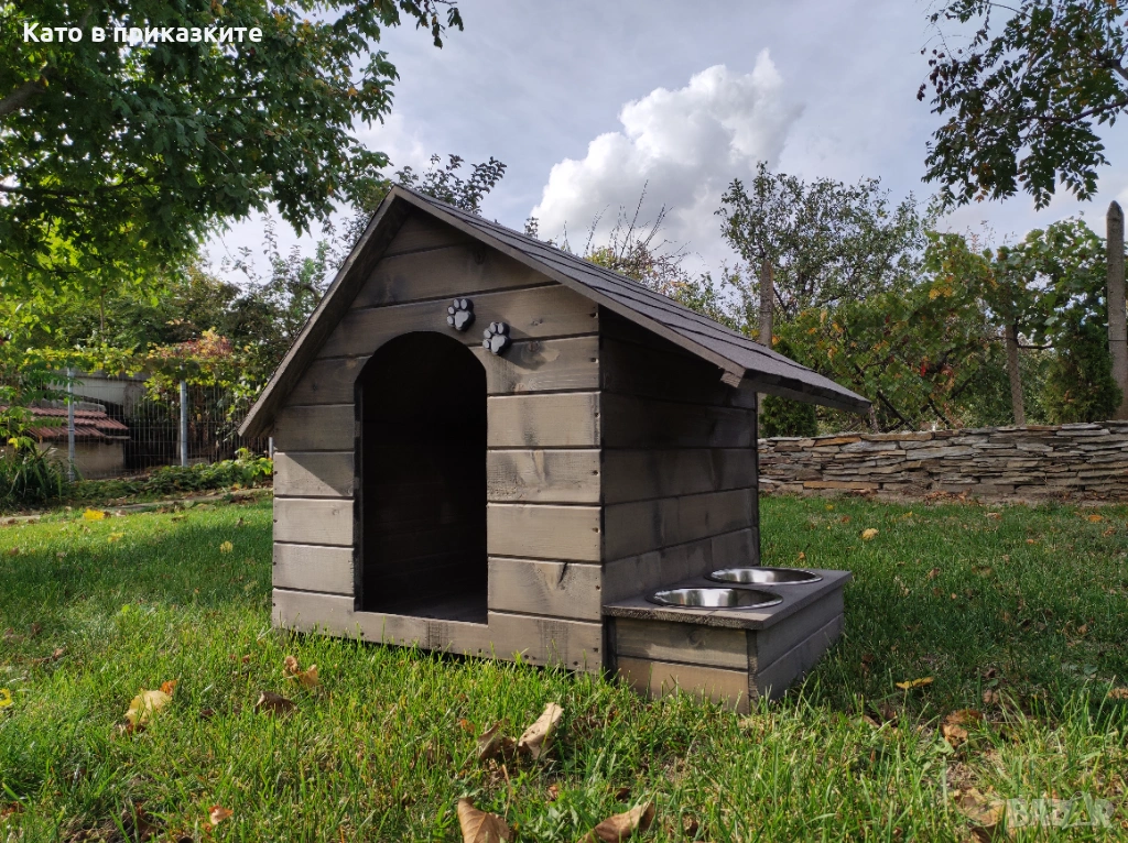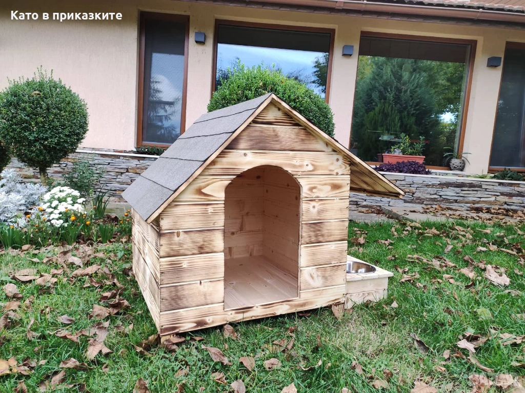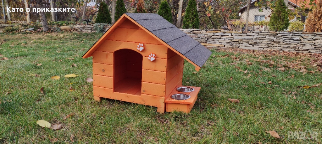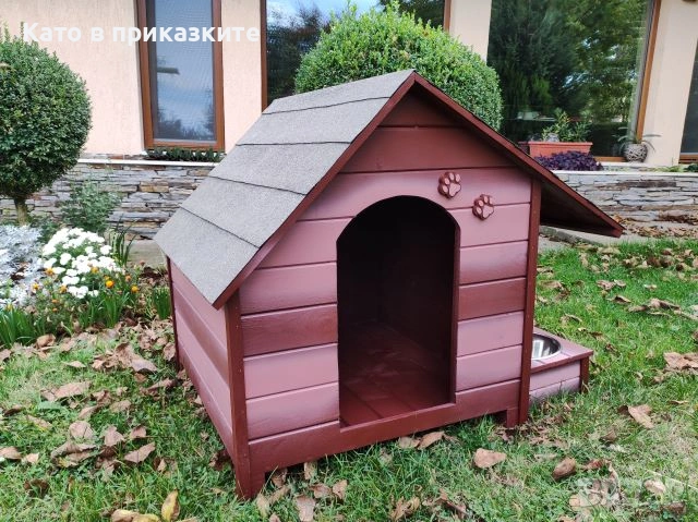 къща за куче. Подходяща е за използване, както на открито в двора, така и в закрити помещения, като например вашата всекидневна, тераса или коридор. Къщите за кyчета са изключително прецизно изработени, като при тяхното конструиране са използвани единствено и само висококачествени материали, което ги прави красиви и в същото време здрави и напълно безопасни за вашите кучета. Дървеният материал използван при изработката на къщата за кучета е от импрегниран и добре обработен иглолистна дървесина. Използваме единствено и само екологични и високоефективни лепила и консумативи, които гарантират за максималната безопасност на вашето куче и безупречната устойчивост на къщата срещу атмосферни влияния и други вредители. Разполага с монтирани крачета, за по-лесно местене и транспортиране, а същевременно по този начин къщата за кучета е по-високо от земята, което допринася за по-добрата топлоизолация. Голямо предимство на нашата къща е удължената стряха на покрива, която покрива и предпазва дървената поставка с купите.