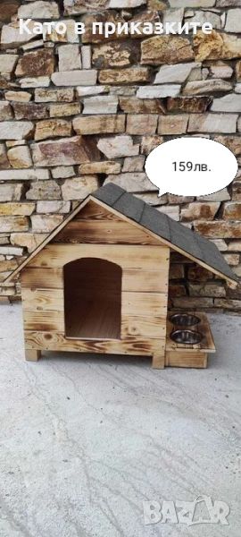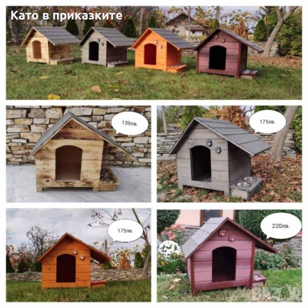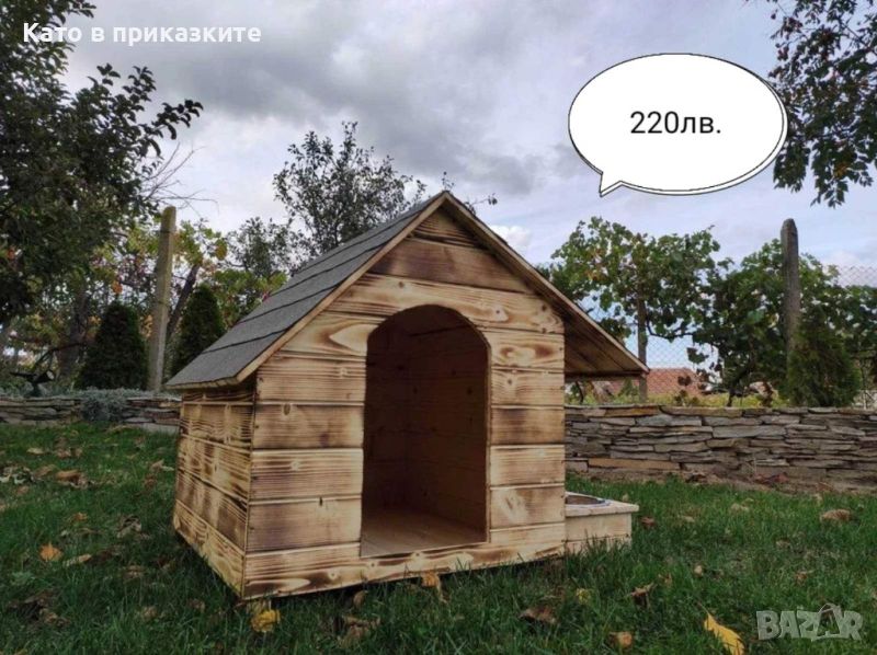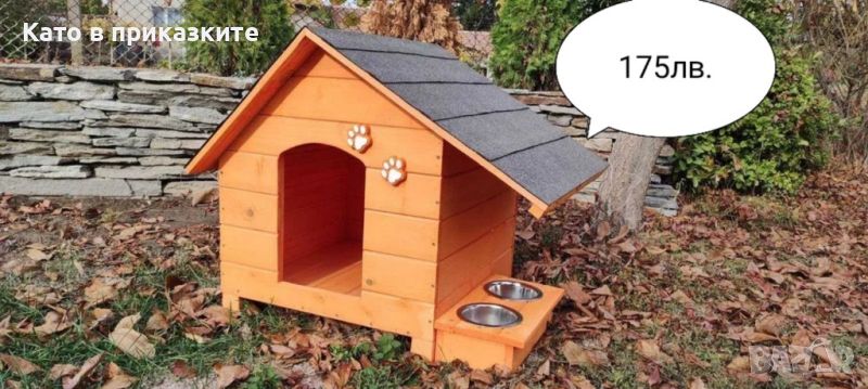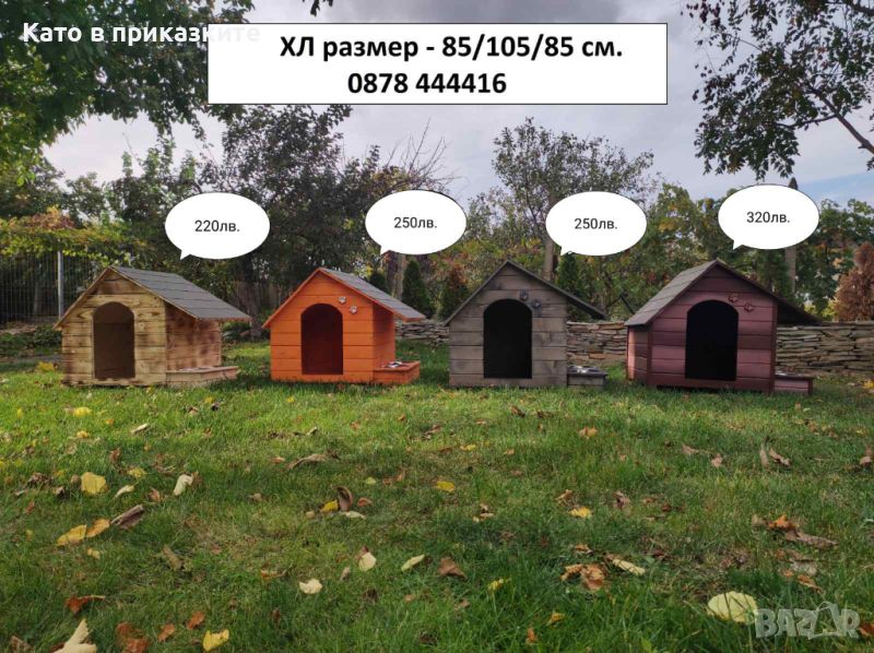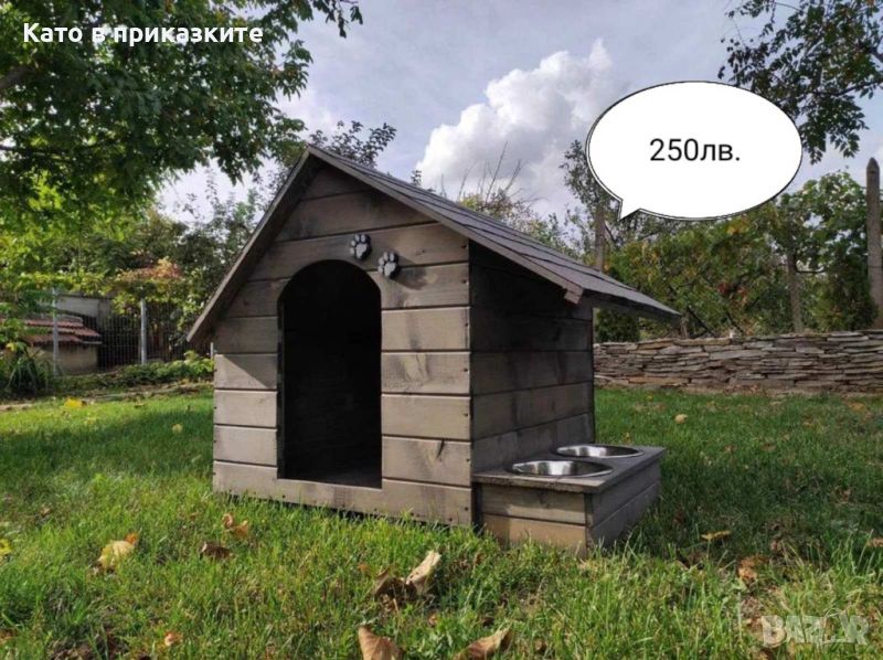 къща за куче. Подходяща е за използване, както на открито в двора, така и в закрити помещения, като например вашата всекидневна, тераса или коридор. Къщите за кyчета са изключително прецизно изработени, като при тяхното конструиране са използвани единствено и само висококачествени материали, което ги прави красиви и в същото време здрави и напълно безопасни за вашите кучета. Дървеният материал използван при изработката на къщата за кучета е от импрегниран и добре обработен иглолистна дървесина. Използваме единствено и само екологични и високоефективни лепила и консумативи, които гарантират за максималната безопасност на вашето куче и безупречната устойчивост на къщата срещу атмосферни влияния и други вредители. Разполага с монтирани крачета, за по-лесно местене и транспортиране, а същевременно по този начин къщата за кучета е по-високо от земята, което допринася за по-добрата топлоизолация. Голямо предимство на нашата къща е удължената стряха на покрива, която покрива и предпазва дървената поставка с купите. Размер: М Доставка до офис на Еконт - 12лв. Дължина:60cм. Ширина:80cм. Височина:60cм. Светъл отвор:22/33см. Аксесоари М: -Врата от PVC(Кристал) -11лв. -Легло от водонепромокаем плат - 28лв. Може да разгледате в другите ни обяви! Размер: ХЛ Доставка до офис на Еконт - 18лв. Дължина:85cм. Ширина:100cм. Височина:85cм. Светъл отвор:30/50см. Аксесоари ХЛ: -Врата от PVC(Кристал) -17лв. -Легло от водонепромокаем плат - 39лв. Може да разгледате в другите ни обяви! -Ръчно изработени -Безвредни боя и лак на водна основа. -Естествена дървесина -Произведени в България Научи повече на тел.: -0878444416