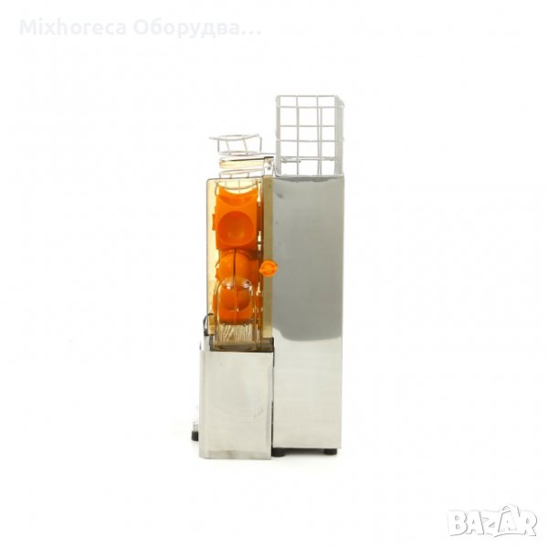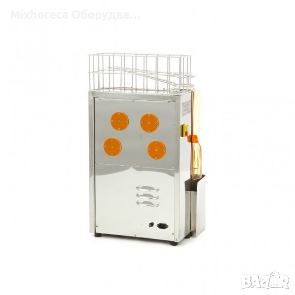 Aвтоматична сокоизстисквачка за цитрусови плодове с капацитет 8 кг, състояща се от съдове от неръждаема стомана, корпус и горна кошница. Kомпактен настолен модел и върши работата си бързо и добре. Голямо предимство е лесното й почистване. Силен двигател и система за изцеждане на сока с метални зъбни колела. Корпус от неръждаема стомана, горна решетка и кошове . Използва 18-25 портокала в минута. Диаметър на портокалите 60-80 мм. Максимална височина на бутилка/стъкло 16 см.