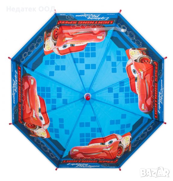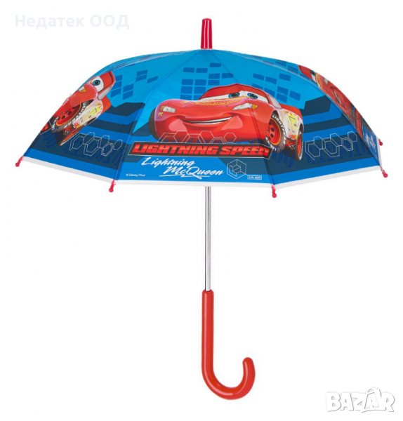 Чадър за дъжд за момче в син и червен цвят с дизайн Cars. Има дръжка с извита дръжка и механизъм за ръчно отваряне.