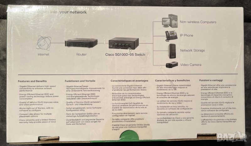 Модел: Cisco SG100D-05 5-Port Desktop Gigabit Switch НОВ (пълен комплект в кашон)
