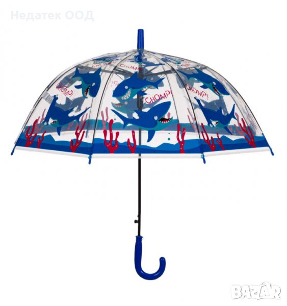 Прозрачен чадър за дъжд с дизайн на сини акули. Има дръжка с извита дръжка и механизъм за автоматично отваряне.