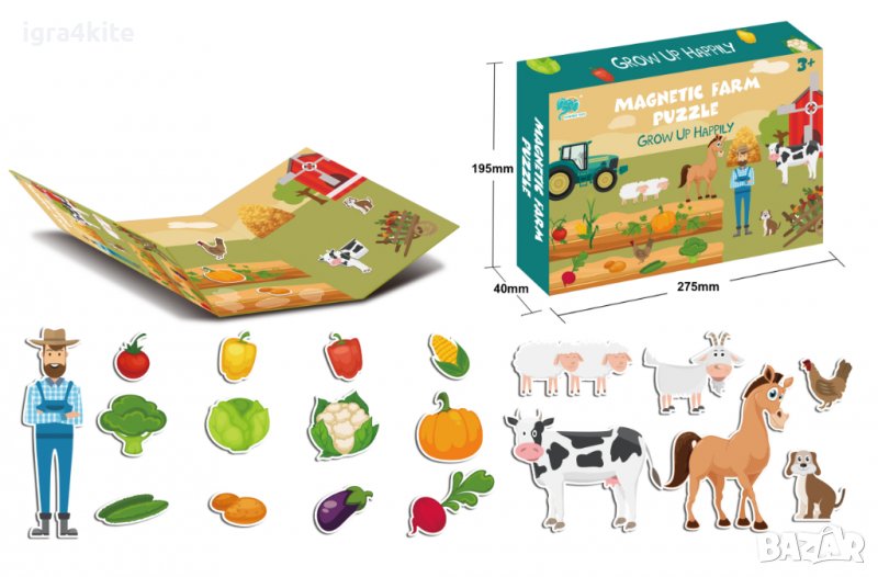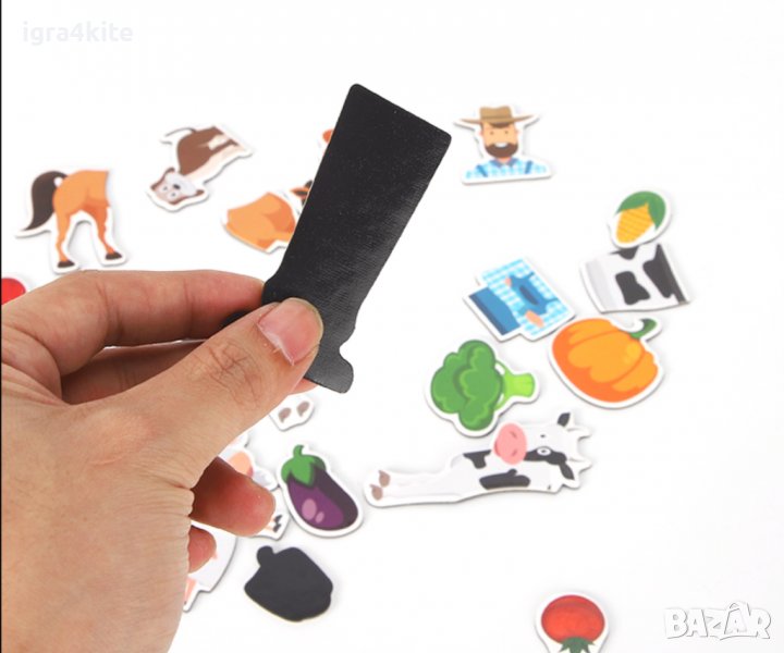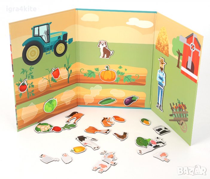 Всяка страница има специални места, където да се полепят 28-те магнитни части, включени в комплекта: фермер, зеленчуци и животни.