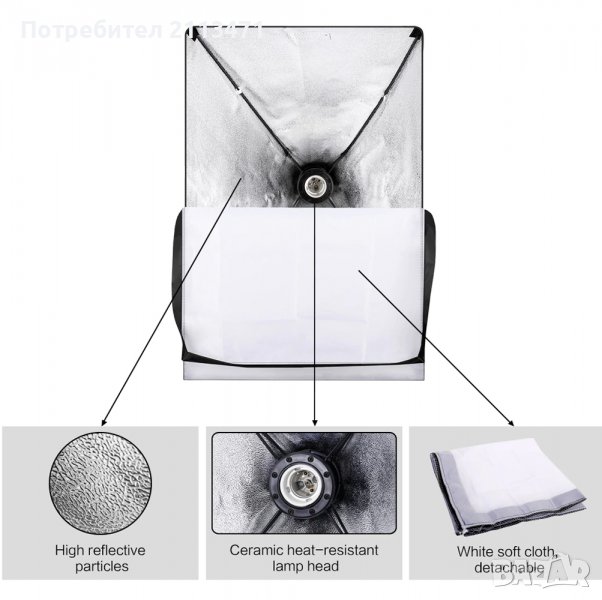 Софтбоксът е изработен от полимерни материали, силно отразяващи със бял дифузьор. Сребърно вътрешно лице за минимизиране на загубата на светлина и максимално разпространение на светлината.