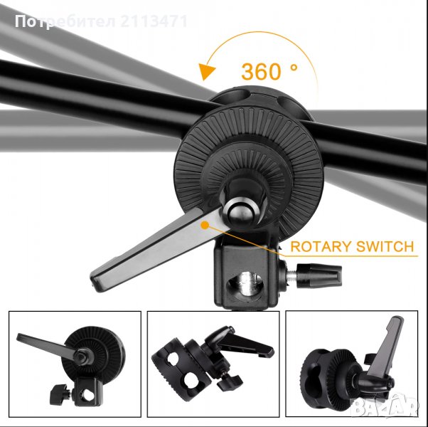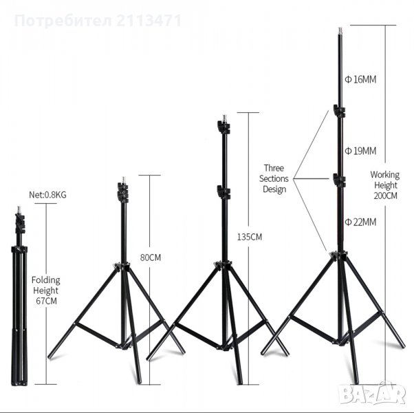 Стойка за осветление: сгъната височина (68 см), работна височина до (200 см).