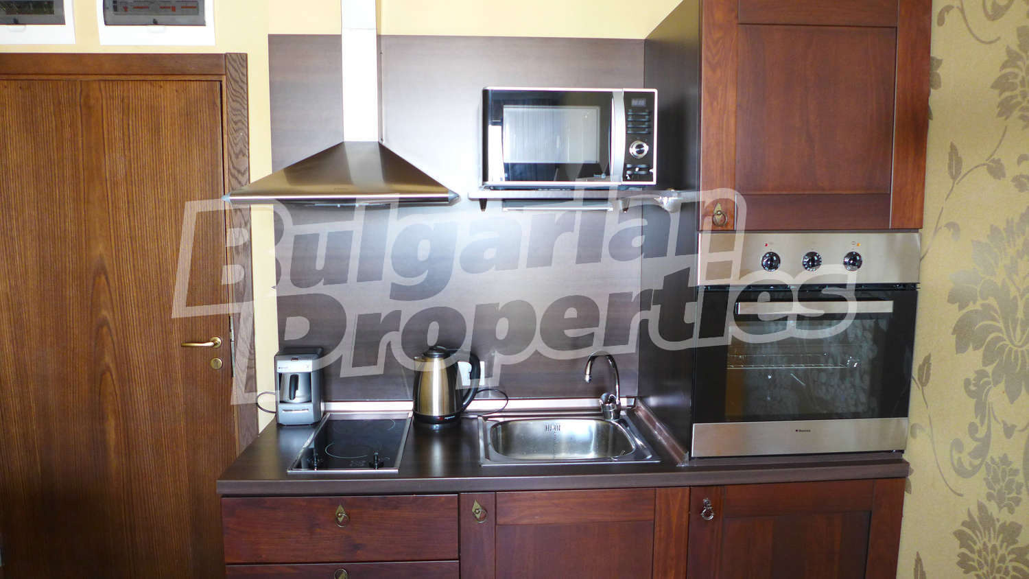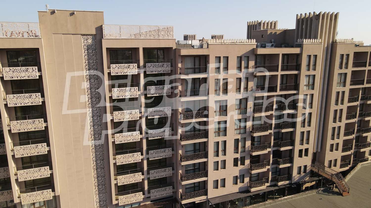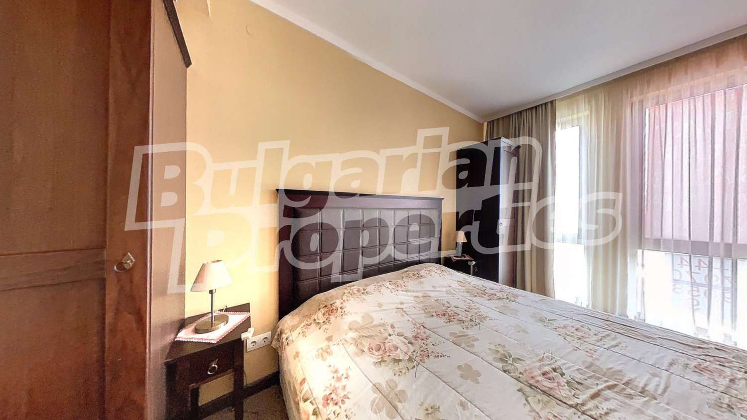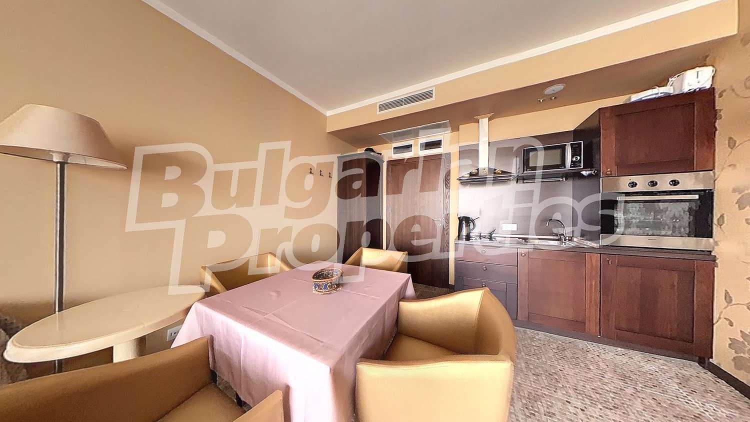 Апартаментът се намира на четвърти етаж и предлага уникална гледка към основния басейн. Имотът е в отлично състояние и никога не е отдаван под наем. Всички мебели са нови. Това луксозно жилище заема обща площ от 70.76 кв.м., от които чистата площ е 59.79 кв.м. и общите части са 10.97 кв.м. Състои се от просторна дневна с изцяло оборудван с всички необходими електроуреди кухненски бокс, една спалня, баня с тоалетна и вана и прекрасна тераса. Стаите са завършени с подови настилки от теракот и мокет, ПВЦ дограми. Имотът от ново строителство разполага с кабелна телевизия, интернет, СОТ и телефон. Жилището е комфортно и изискано, предлага всички необходими удобства за пълноценна почивка. Пълното обзавеждане и оборудване може да видите на снимките.
