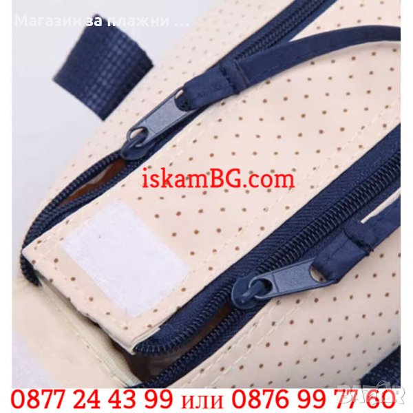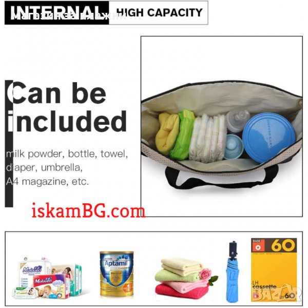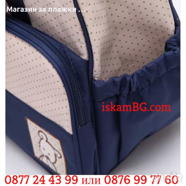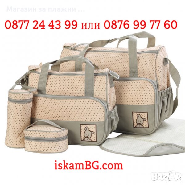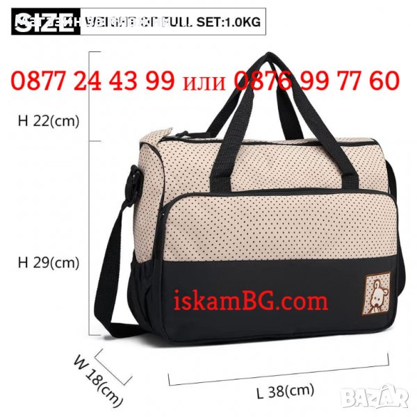 В комплекта ще намерите голяма чанта, малка чанта, несесер, термо опаковка за шише и подложка за смяна на пелени. Всяка от двете чантите е оборудвана с дълга регулираща се дръжка удобна за носене на рамо или пък за поставяна на бебешката количка. Също така чантите разполагат с по 2 бр. къси дръжки за носене в ръка. И двете чанти разполага с вътрешни и външни джобове в които ще подреждате всички необходими аксесоари за ежедневната разходка навън.