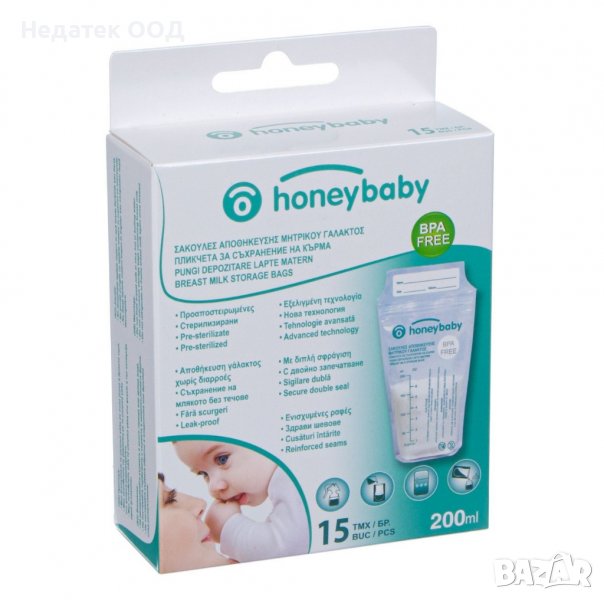 Торбички за съхранение на кърма, предварително стерилизирани, без течове с модерна технология, двойно запечатване и подсилени шевове. Лесно се съхраняват във фризера и се размразяват под течаща вода и можете да затоплите кърмата, като поставите запечатаната торбичка в съд с топла вода. Опаковката съдържа 15 бр.