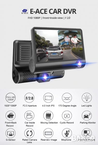 Автомобилен ДВР с голям дисплей и Три камери, с които да записвате в купето, отпред и на паркинг.