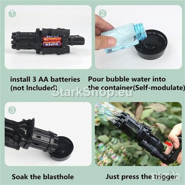 Да се забавлявате с пистолета за балончета е изключително лесно – заредете с батерии, поставете контейнерчето със сапунена течност на предназначеното му място, натиснете спусъка. Готово! Вече можете да се наслаждавате на множеството мехурчета.