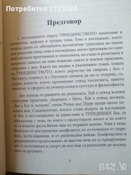 Това е изследване, което излиза далеч от обичайната догматична трактовка на някоя доктринална тема; това е изследване, което призовава не само библейските проучвания и теологията, но също и религията в широкия смисъл на това понятие, както и всички практики, свързани с нея. Както ще видим в различните глави, темата за ТРИЕДИНСТВОТО, която директно ни свързва с Бог, с Неговата същност и с Неговите начини да ни се открива, съдържа аспекти, които преминават отвъд теологията, защото навлизат в сферата на универсалната култура и философията. Бог излиза от рамките на религията, Той е отвъд всички културни практики, свързани с Него, Той е отвъд догмата. ”Бог е Бог и толкова”. Книгата е в отлично състояние.
