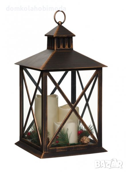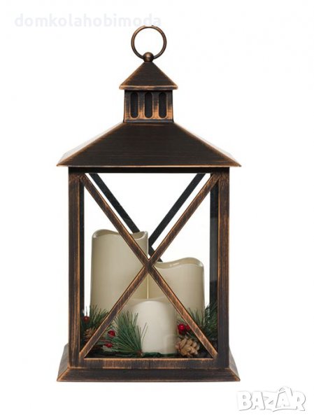 Коледен декоративен пластмасов бронзов фенер с 3 led свещи и борови клонки, шишарки и имел.