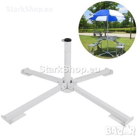 Искате ли да използвате вашия плажен чадър не само на плажа, но и в градината, до басейна, до пясъчника, пред заведение или на тераса? Това е съвсем лесно, когато имате такава метална стойка за чадър. Стойката е метална и може да държи градински или плажни чадъри с диаметър на долната тръба до 35 мм. Най важното нещо при употребата и е да бъде фиксирана здраво към земята. Това може да се случи по два начина: Първият е да се дюбелира към земята т.е. да се закрепи с анкерни болтове към земята. Този метод е удобен и надежден, но има няколко недостатъка – преместването на стойката на друго място ще е трудна, терена може да не позволява поставяне на анкери. Тогава втория вариант е поставянето на 4бр. плочки с размери 40х40см между ребрата на стойката. Тя е специално проектирана за този начин на фиксация. Тези плочки ще осигурят достатъчна стабилност дори при умерен вятър.