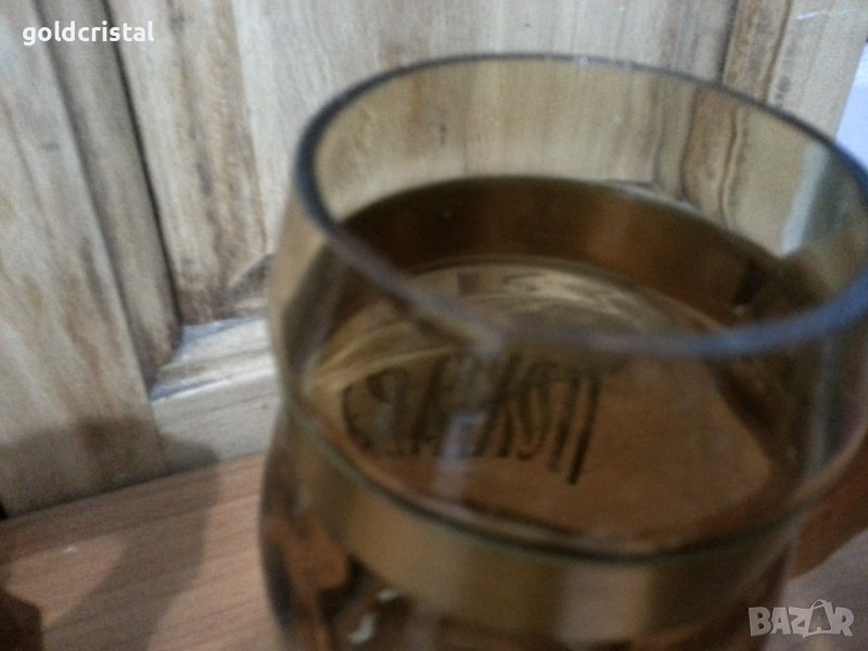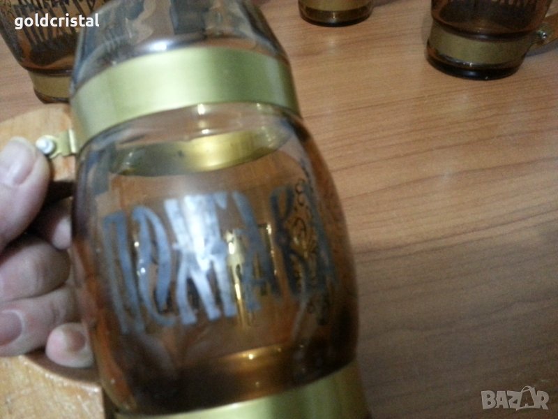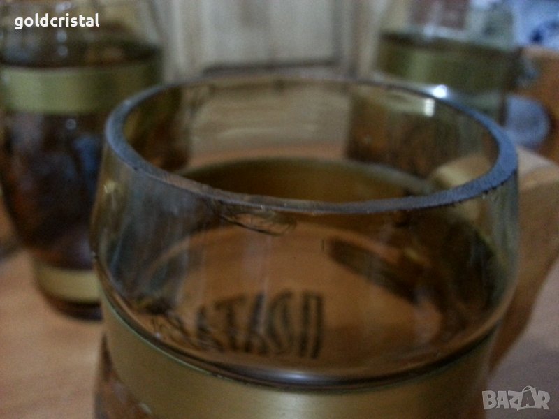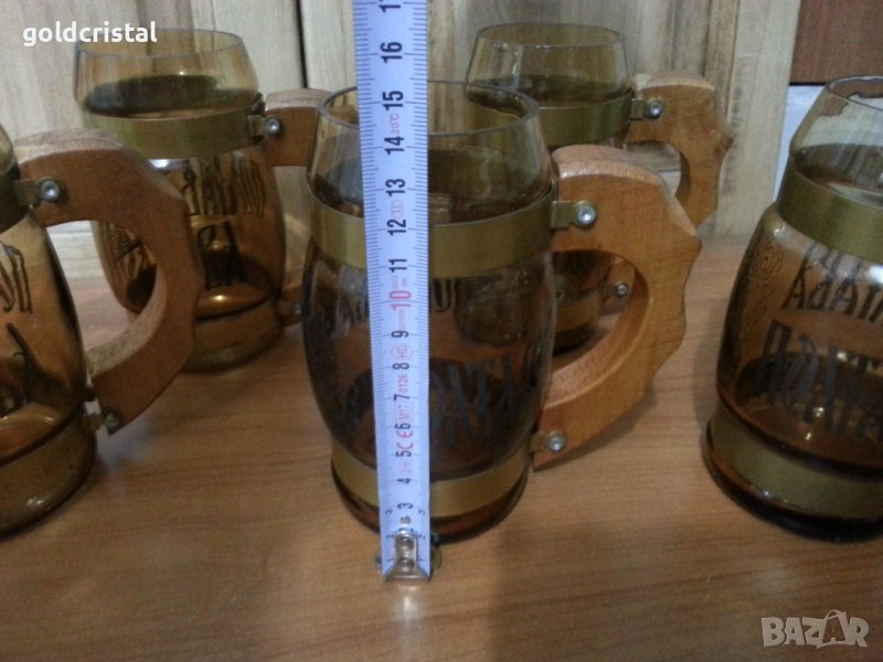 Стъклени чаши халби с дървени дръжки Полтава цветно кафяво стъкло 5бр идната с малка забележка сервиз комплект сет лот ретро арт декор винтидж колекция стари антикварни предмети обзавеждане за дома и семейството подходящи за подарък за ценители и колекционери