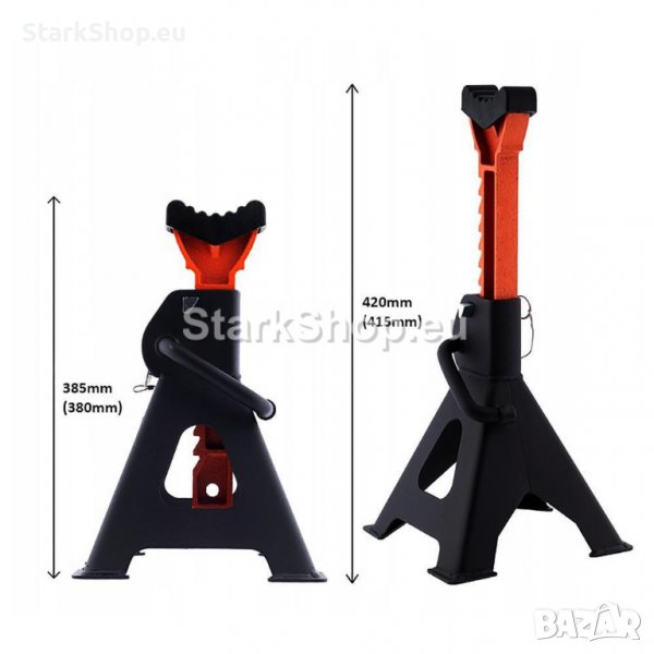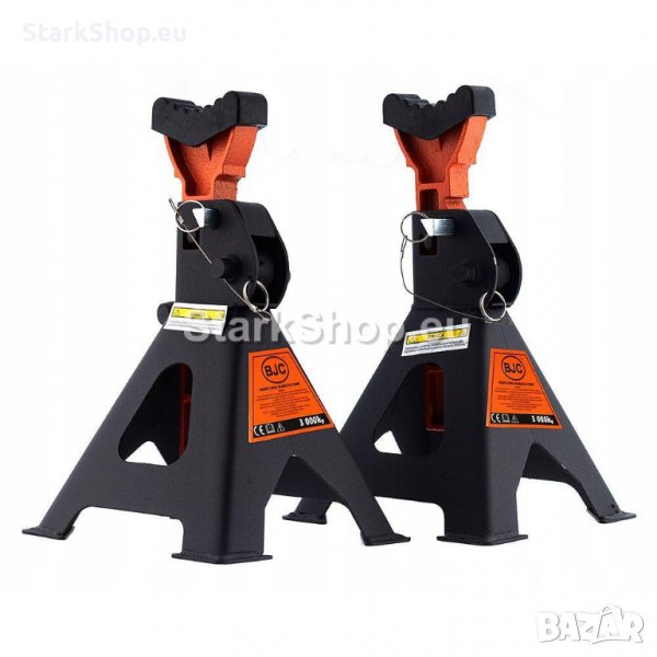 Комплект от 2 броя подпорни стойки за автомобил, с максимална товароносимост 3 тона (3000 кг), снабдени с клин за заключване и гумени уплътнения в горната част за стабилно и противоплъзгащо захващане.