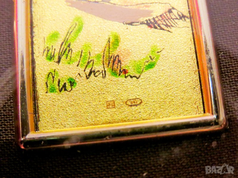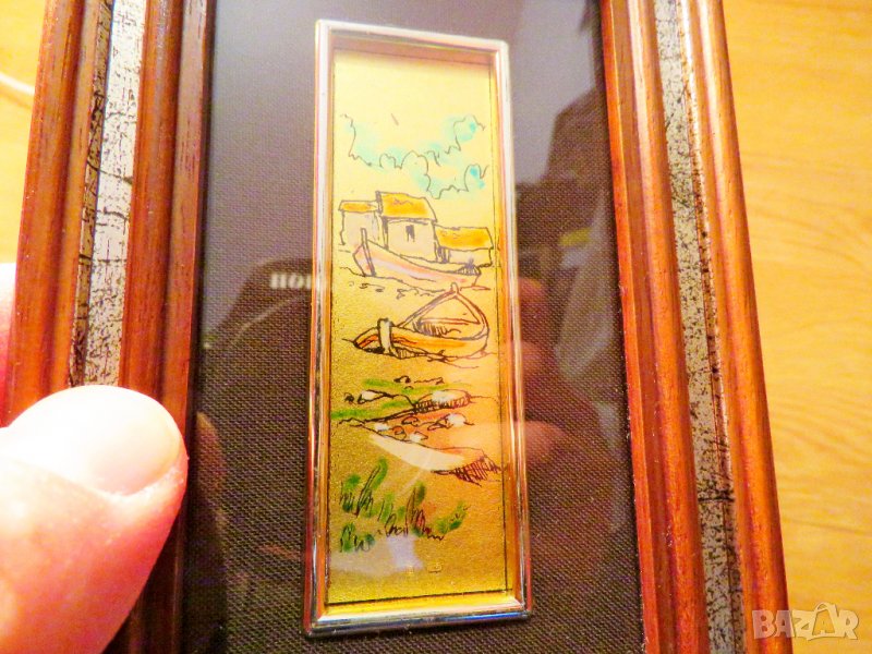 Старинна златна картина рисувана върху златно фолио - Две лодки и къщи - с маркировка за злато ( 23 карата ) и сертификат за автентичност на гърба - за ценители и колекционери .