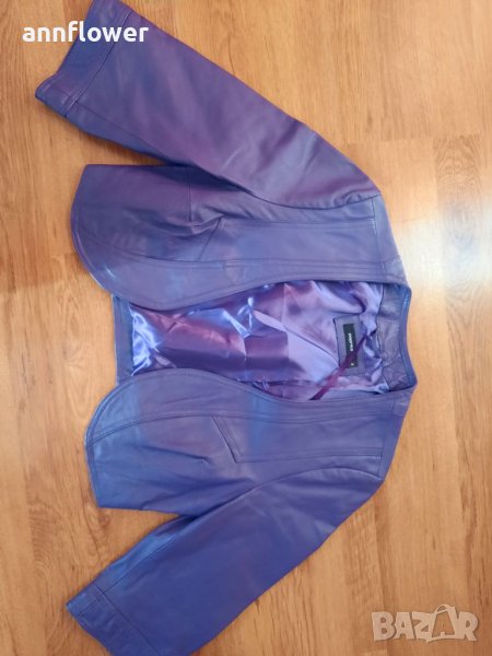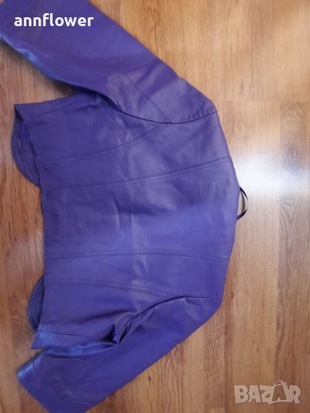 Якето е ново но няма етикет. Цвят лилав, материя естествена кожа. Размер S. Дължина 40см. Ширина на рамената 37см, ширина в мишниците 47см, дължина на ръкава 41см.