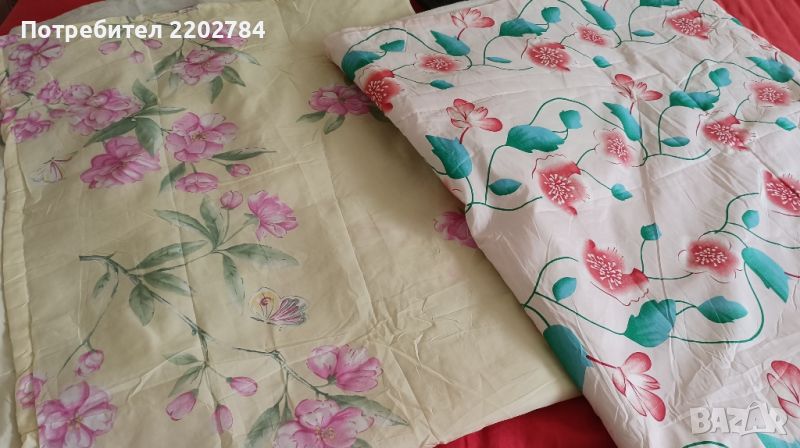 Второто е бледо розово с червени цветя.Ново,без етикет.Има много тънък слой вата между двата плата.140/180см.