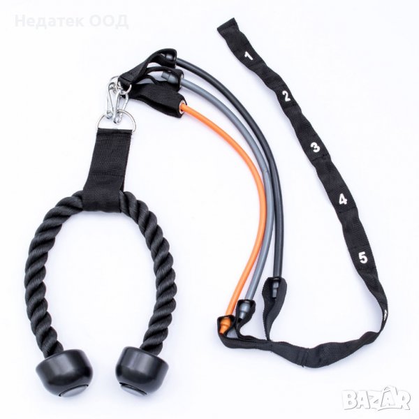 Тренировъчна лента, идеална за бързо укрепване на широк спектър от мускули. Персонализирайте всяка тренировка, за да тренирате ефективно трицепсите и корема си. Проектиран е с висококачествени устойчиви ленти, които са лесни за поставяне и сваляне. Лесно регулируем и регулируем за всички височини, със седем нива на съпротивление за укрепване и тонизиране на трицепсите. Подходящ е за офис или домашна употреба.