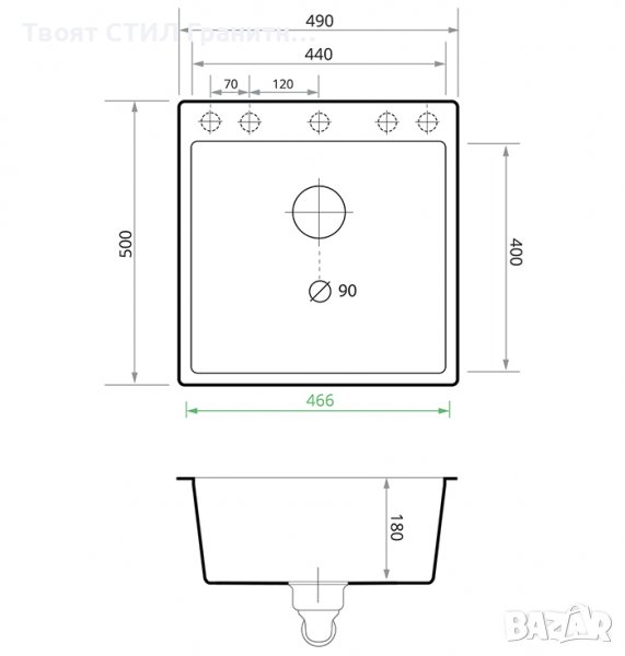 Снимките на продукта показват предлагания монтаж със сифони Твоят Стил. Показаните на графиките преливник и цедка не са част от мивката и се продават отделно.