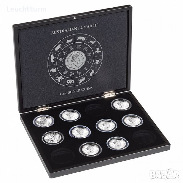 Елегантна черна презентационна кутия за 12 броя сребърни“Lunar III”монети (1 oz. издание) в оригинални капсули.