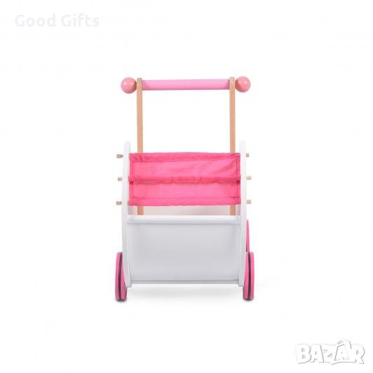 Тази красива дървена количка за кукли в нежни цветове е любима играчка на малки госпожици, които обожават да играят и да се грижат за своите кукли. Играчката е изработени от висококачествени, безопасни за децата материали и изключително много се доближава до реалните модели. С нея Вашата малка принцеса ще се забавлява както вкъщи, така и навън. В същото време детето ще развива своята фантазия, докато бута любимата си кукла , а също така ще се превъплъти в ролята на майка и бавачка. Така ще се научи да бъде по-отговорна и грижовна.