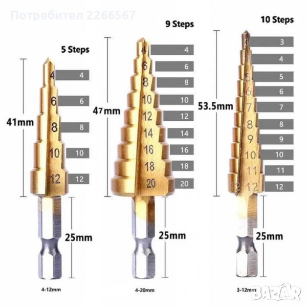 Качествени немски стъпаловидни свредла HSS-TiN с титаниеово покритие - комплект 3 бр.