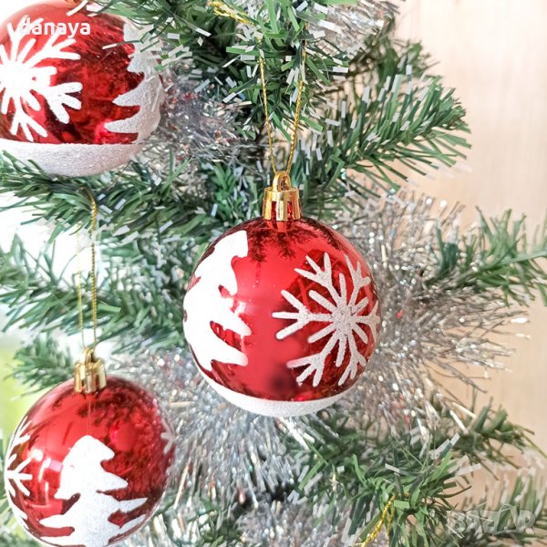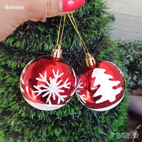 Комплект от 6 броя коледни топки за елха. Красиви играчки за коледната елха с ярък и интересен дизайн в бяло и червено, с декорация елхички и снежинки. Топките се предлагат в прозрачна PVC кутия. Стоят много ефектно на елхата или като допълнение към гирлянди.