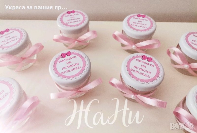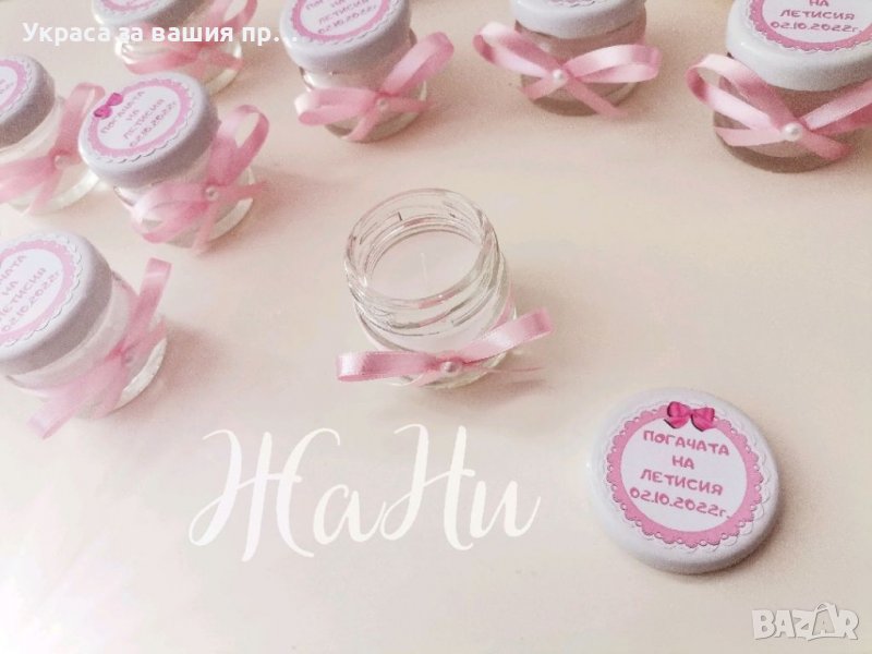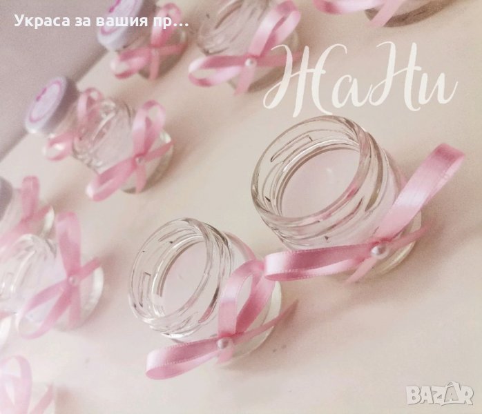 Свещ в украсено бурканче подаръчета за гостите на бебешка погача → Обява 38546420