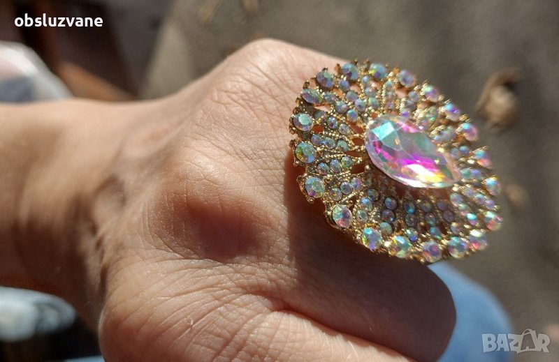 Внушителен моден силно искрящ пръстен с многоцветни кристалчета тип хамелеон.