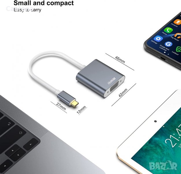 - Преносим адаптер Benfei USB-C към VGA с компактен дизайн свързва компютър, настолен компютър, лаптоп или други устройства с USB-C порт към монитор, проектор, HDTV или други устройства с VGA порт. Поставете това леко устройство в чантата или джоба си, за да направите бизнес презентация с вашия лаптоп и проектор или разширете екрана на работния плот до монитор или телевизор; необходим е VGA кабел.