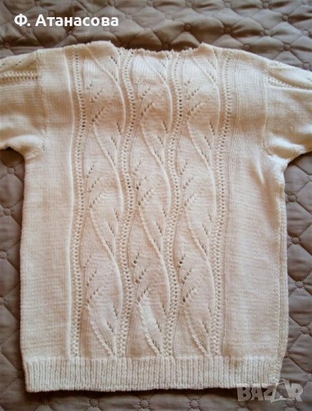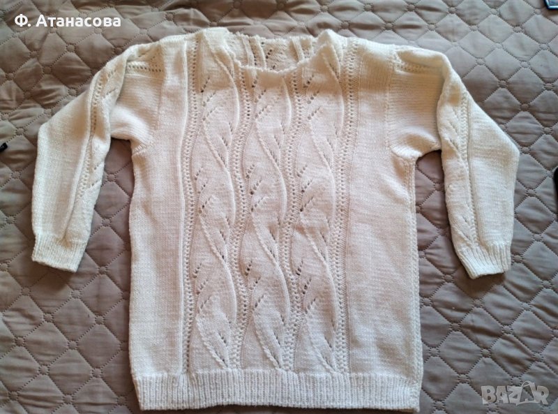 3. Ръчно плетен бял пуловер с красива плетка. Трябва да му се пришие бие или да се довърши частта около врата.