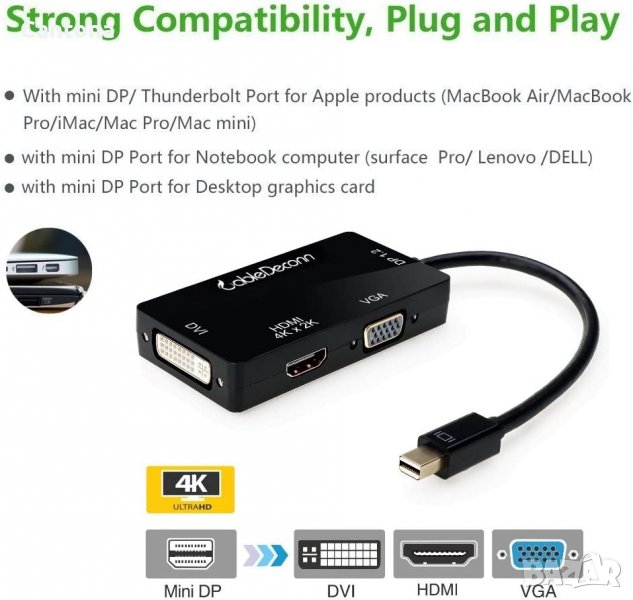 Свързва лаптоп или настолен компютър, оборудван с mini DisplayPort DP, към HDTV, монитор или проектор с HDMI/DVI/VGA; Поддържа само 1 изход на дисплея наведнъж, изисква се HDMI/DVI/VGA кабелПредава аудио и видео с висока разделителна способност от вашия компютър към HDTV дисплей за видео стрийминг или игри чрез HDMI; Свържете и конфигурирайте монитора си за разширен работен плот или огледални дисплеи