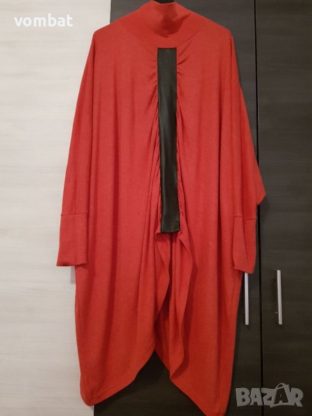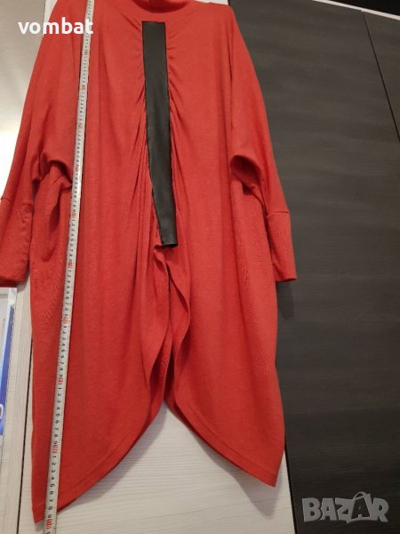 Свободна дълга блуза тип поло универсална. Дължината и в страните е 110см., дължина на ръкава 80см. В средата където е кожената лента отпред е 54см., а отзад е 60см