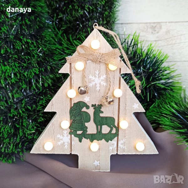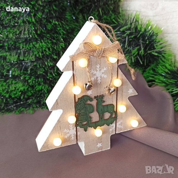 3202 Дървена светеща коледна елха със звънчета, 16см