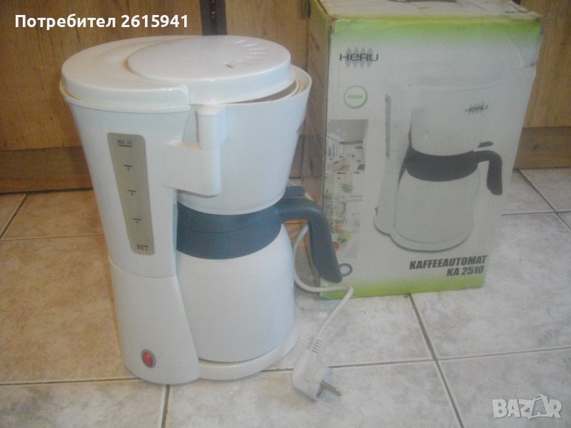 Почто нова, немска 900 ватова електрическа кафе машина, тип шварц кафе. Марка и модел - Heru KA2510. Производство - оригинално Германия - Made in Germany - упоменато на маркировките. Наличие на миещ се постоянен филтър. Кана с керамично покритие и вакумно плътно затваряне. Машината е за 10 кафета. Височина на машината - 330 мм, ширина - 220 мм, дължина - 180 мм. Машината е прибрана в оригиналната си немска картонена опаковка.