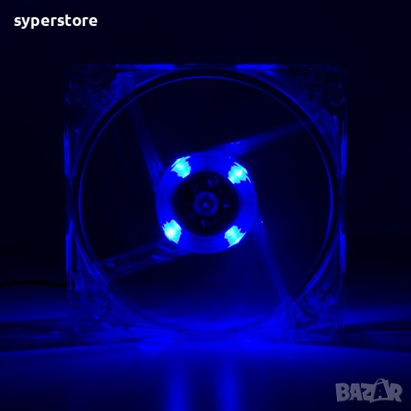 4 integrated blue LEDs illuminate the transparent acrylic fan.